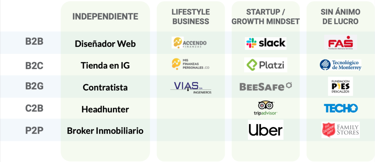 | Independiente | LifeStyle Business | StartUp / Growth Mindset | Sin ánimo de lucro | |